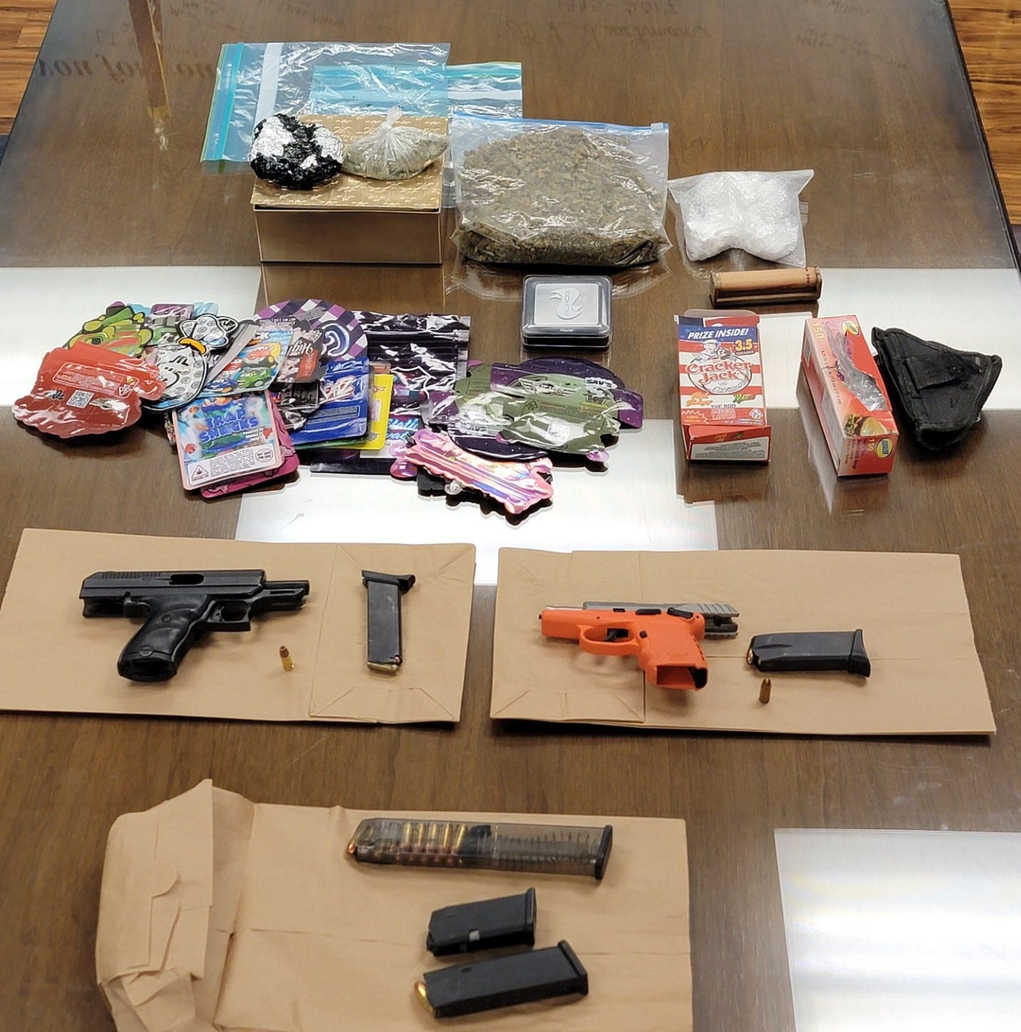 RAP: felony warrant, possession on a firearm by a prohibited person, possession of ammunition by a prohibited person, possession of brass knuckles, possession of a controlled substance while armed, possession of a controlled substance for sale, and other drug-related charges.