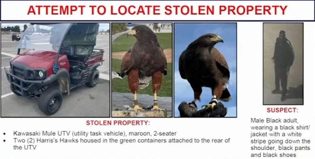 “Affixed to the bed of the UTV were two (brown) Harris’ Hawks housed in green containers,” cops said in a statement. “These hawks are used during the games by a falconer in order to deter other birds in the area.”