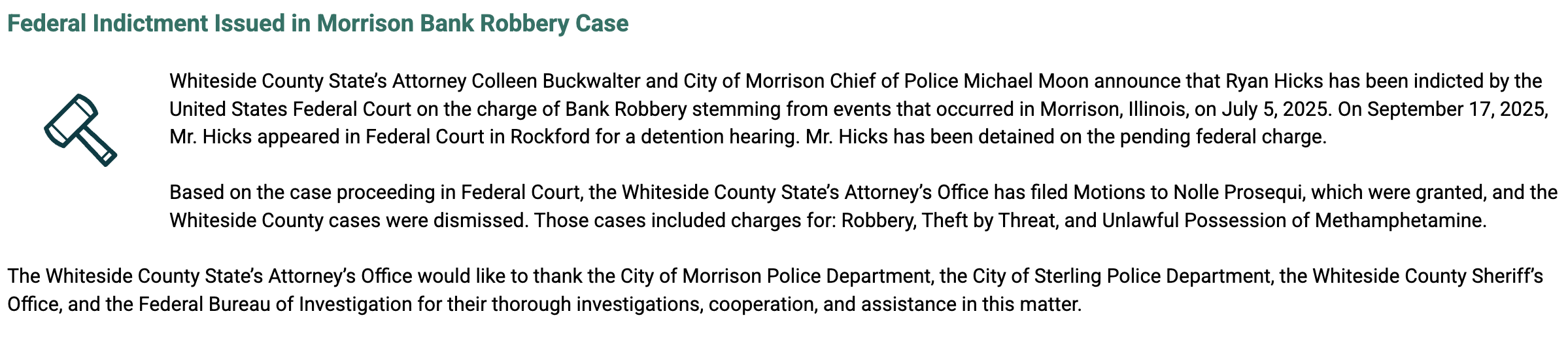 But last week, the state attorney confirmed the feds were taking it over and he’s since been defending himself in Rockford’s federal court in the robbery and also meth possession.