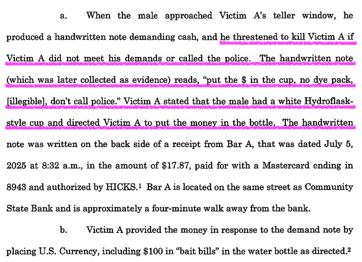 -Ryan Hicks’ alleged note he handed over to a bank teller before threatening her life if she didn’t fill his Stanley cup with cash.