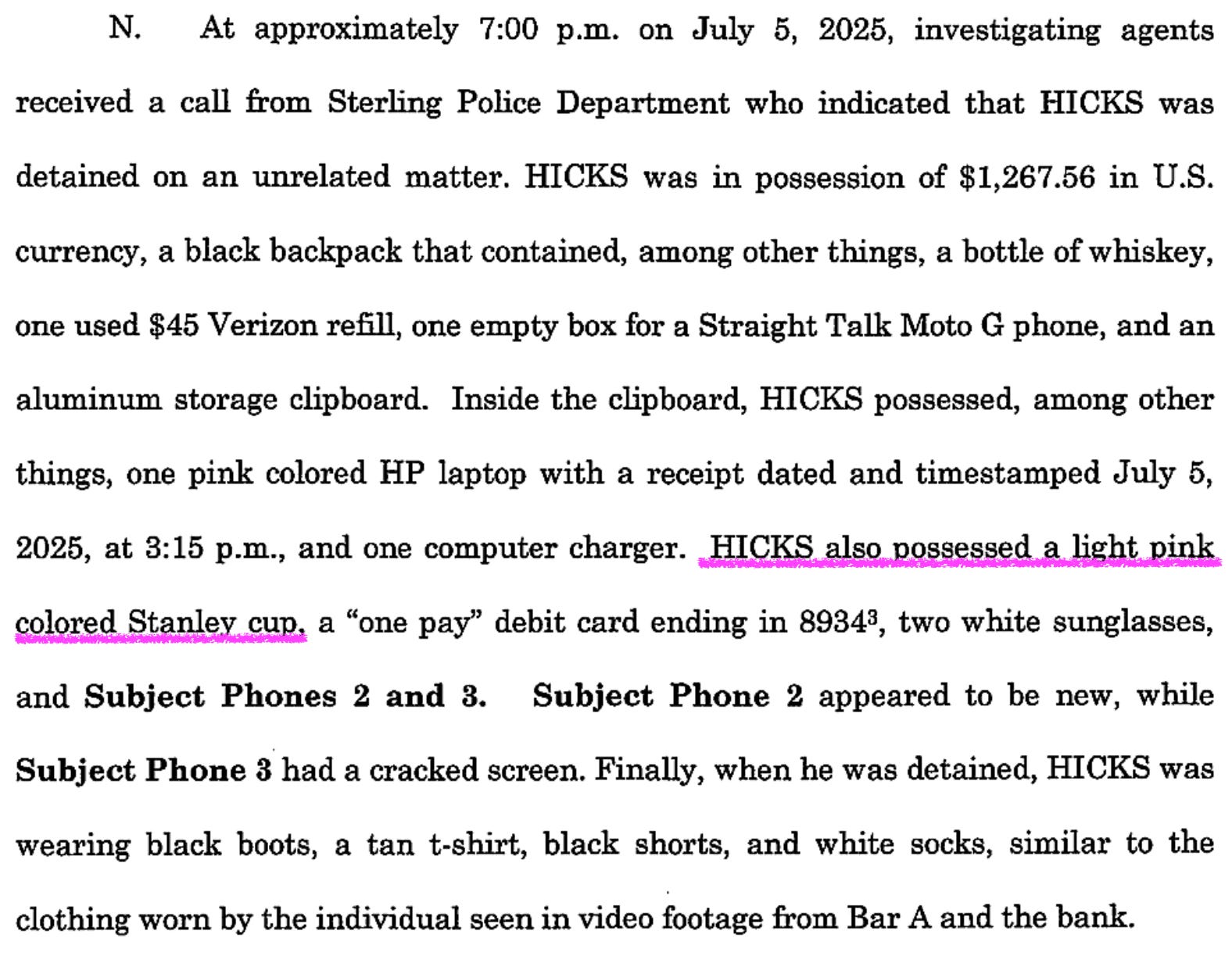 As for the Stanley cup — Hicks allegedly admitted it was his. But said that it wasn’t his makeshift weapon to knock off banks, but his source to sip water.