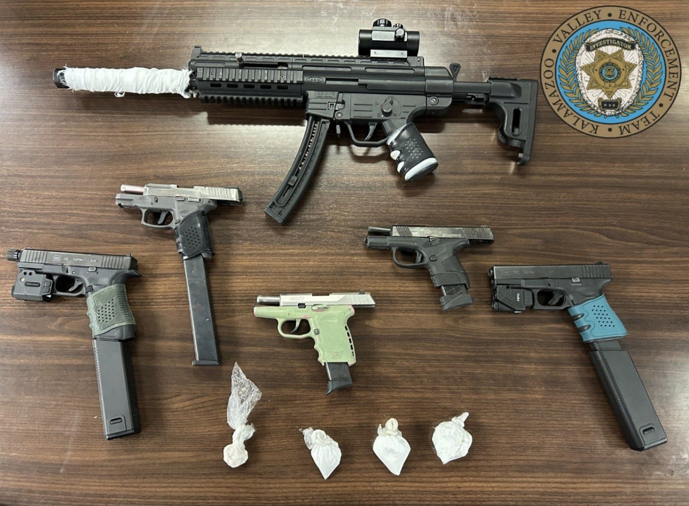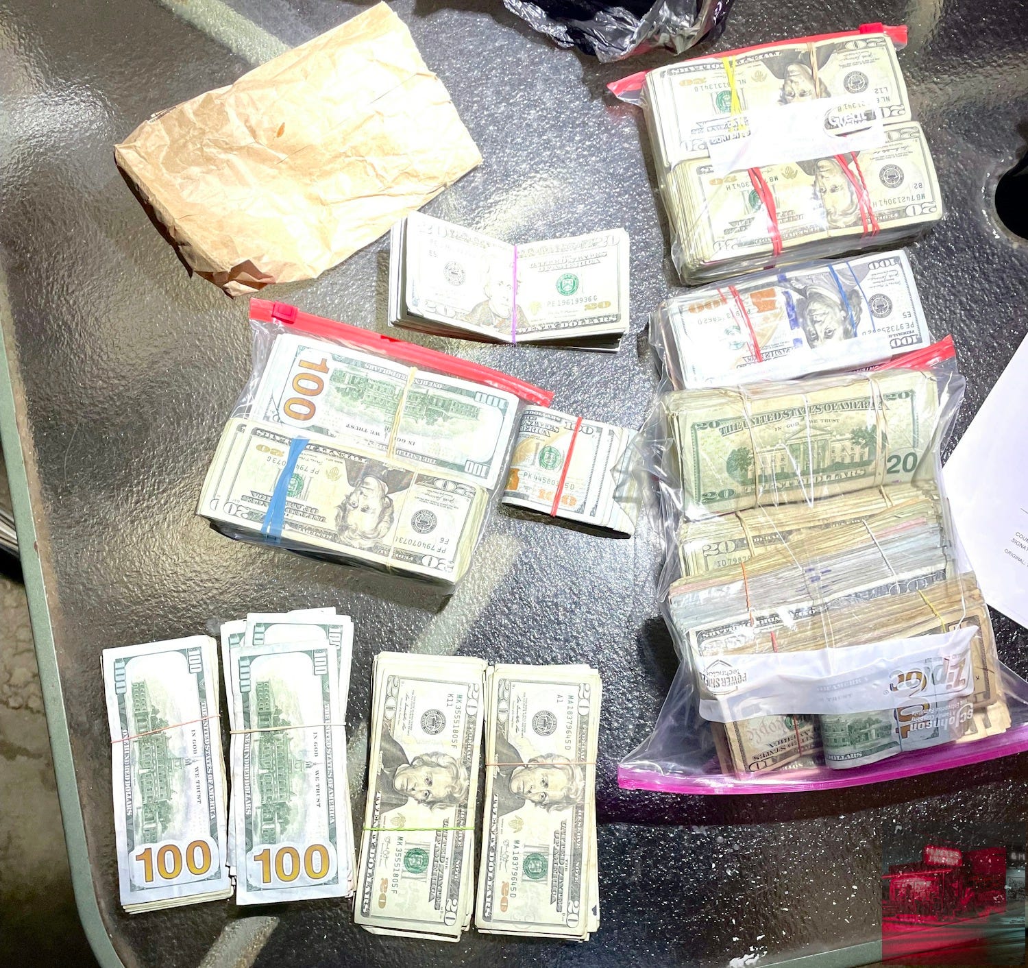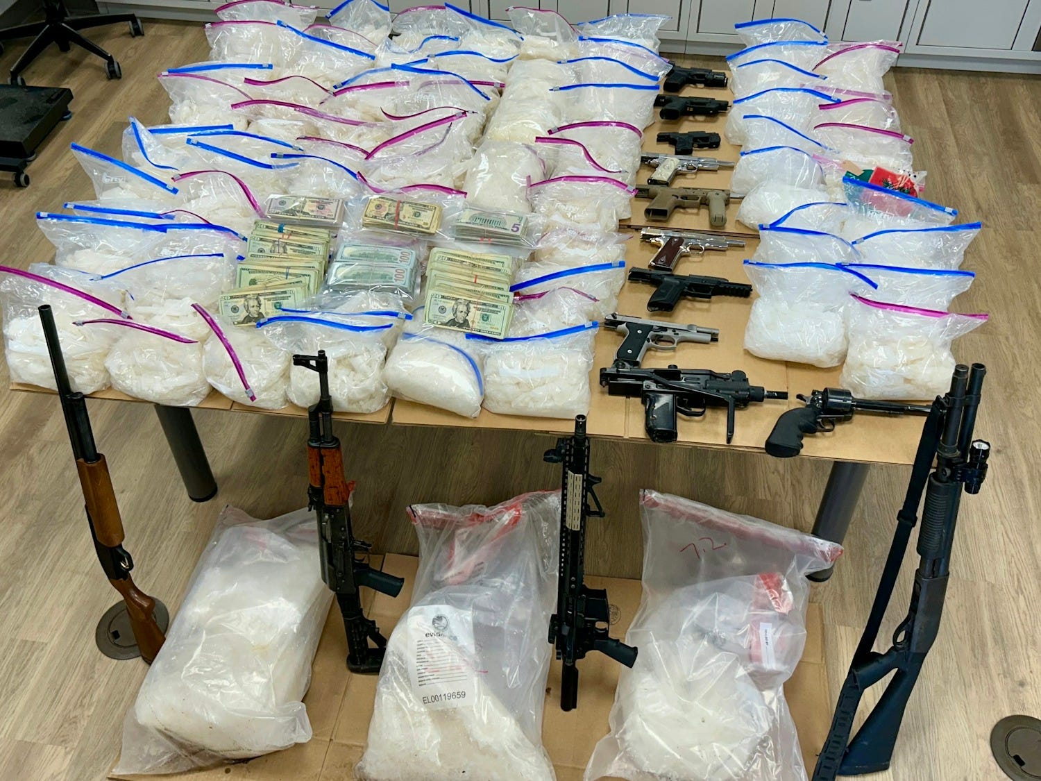 HAUL: 252.2 pounds of ice, 100 gallons of methamphetamine in solution, 14 guns, and bundles of cash