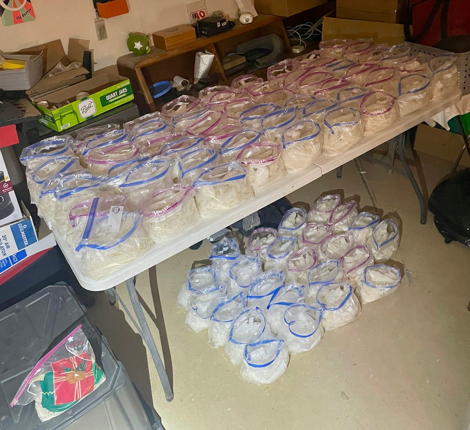 The raid of their farmhouse on West Jensen Avenue resulted in the seizure of 252.2 pounds of ice, 100 gallons of methamphetamine in solution, 14 guns, and bundles of cash.